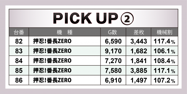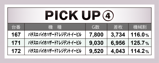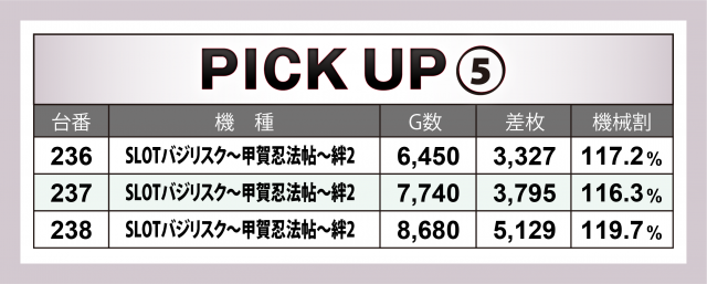 続いては差枚数が目立った好調5機種。『番長ZERO』は横並び5台が全てプラスを刻む中、1台あたりの平均差枚数でさらに上回ったのが『パチスロ バイオハザード7 レジデント イービル』『SLOTバジリスク~甲賀忍法帖~絆2』の2機種。前者は3台平均で+5千枚弱、後者は3台並びで1台あたり+4千枚超を記録した。