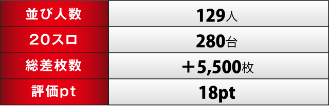 当日の1000円/46枚スロ全280台トータル差枚数は+5,500枚をマーク。前回に比べると数値自体は下がっているが評価ptは18と前回の17を上回り、差枚数の落ち込みは不ヅキもあったのかもしれない。次回取材時にはどちらの項目でも今回を超える成績に期待したい。