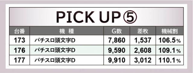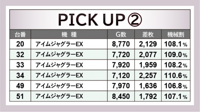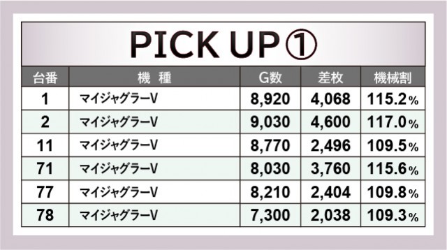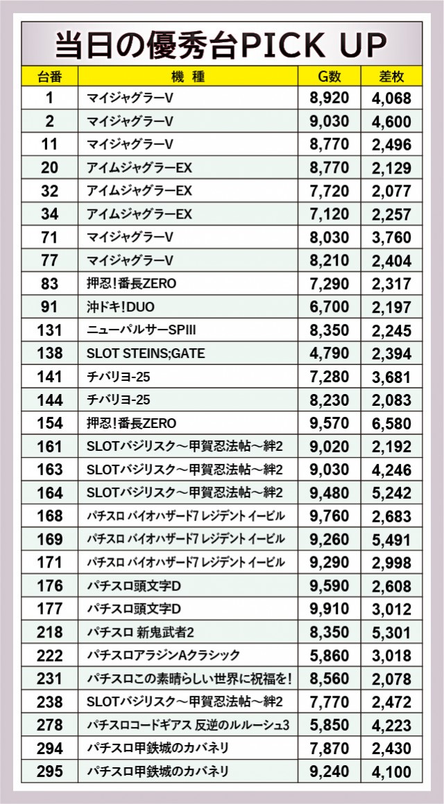 幅広い世代に愛される『ジャグラー』シリーズから、『マイジャグラーV』『アイムジャグラーEX』をピックアップ。どれも多くのゲーム数が消化されているのが印象的だが、それに伴って差枚数も数千枚単位でのプラスを刻む台が多かった。特に『マイジャグラーV』は4,068枚・4,600枚という大台を突破した台もあり、活気だけでなく熱気にも包まれていたことが分かる。