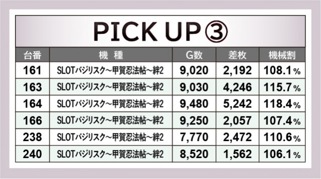 『押忍!番長ZERO』154番台+6,580枚という獅子奮迅の活躍が見られ、『SLOTバジリスク~甲賀忍法帖~絆2』164番台+5,242枚や『パチスロ バイオハザード7 レジデント イービル』169番台+5,491枚といった好記録も生まれた当日。これら人気機種が中心となり、さらには6.5号機から『パチスロ 新鬼武者2』218番台+5,301枚が発生するなど、新旧問わず多くの機種が熱気を放っていたと言えるだろう。