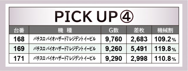 一方でAT機からは、『SLOTバジリスク~甲賀忍法帖~絆2』『パチスロ バイオハザード7 レジデント イービル』『パチスロ頭文字D』の3機種を取り上げる。こちらも消化されたゲーム数に目を奪われるが、やはり回転数を重ねるにつれて、グラフを右肩上がりに伸ばしていたのが鮮烈であるばかり。2千枚OVER台が多発している状況からも、多くのユーザーが手ごたえを感じてレバーを叩いていたはずだ。