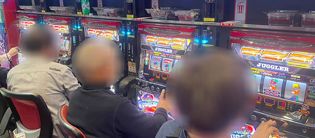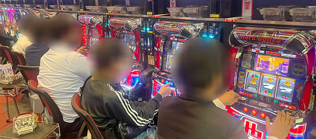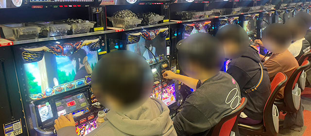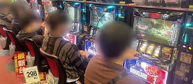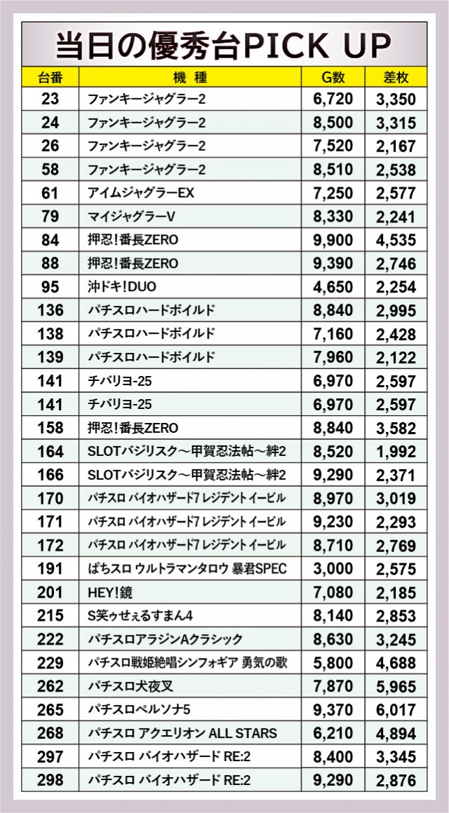 全体的に2~3千枚OVERが目立っているなか、『パチスロ犬夜叉』262番台+5,965枚や『パチスロペルソナ5』265番台+6,017枚など、主に6.5号機から熱気の噴出が見られた。また『パチスロ バイオハザード7 レジデント イービル』では170~172番台の横並びで活気と熱気が放たれ、他にも同じ状況が各所で確認できたのが印象的だ。消化されたゲーム数の多さから、ファンはしっかりと手ごたえを感じていたに違いない。