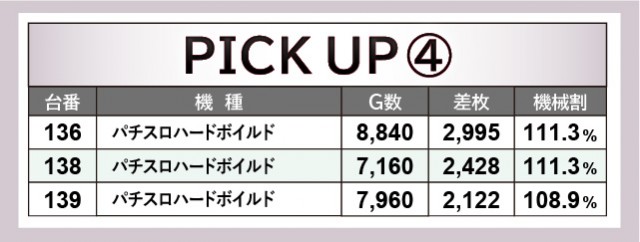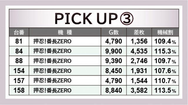 『押忍!番長ZERO』では、8~9千回転OVERが多く見られた。84番台+4,535枚が記録されるなど、今なお人気を集める理由が窺える。また最新機種『パチスロハードボイルド』は、安定したパフォーマンスを披露。136番台+2,995枚が記録されており、ほかの台も追随するように大当りを重ね、ドル箱に手が伸びる状況が珍しくなかった。