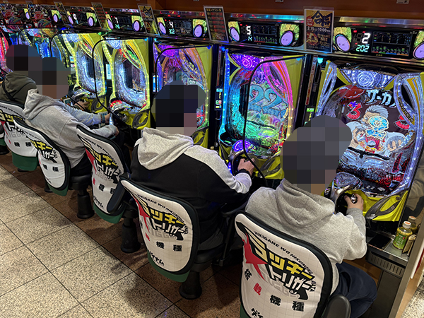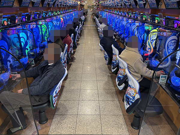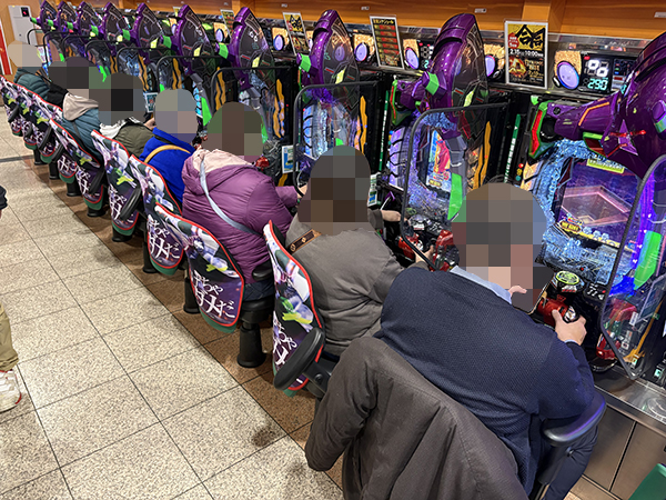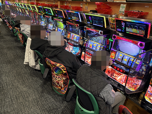 取材時は既に多くのプレイヤーが集結し、パチンコ・パチスロを問わずにぎやかな状況となっていた。