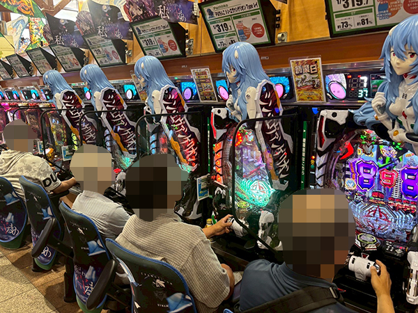 15時ごろの4円パチンコを見てみると「P大海物語5」や「ぱちんこ シン・エヴァンゲリオン Type レイ」が大盛り上がり。魅力的なシーンをシマのあちこちで目にしている。