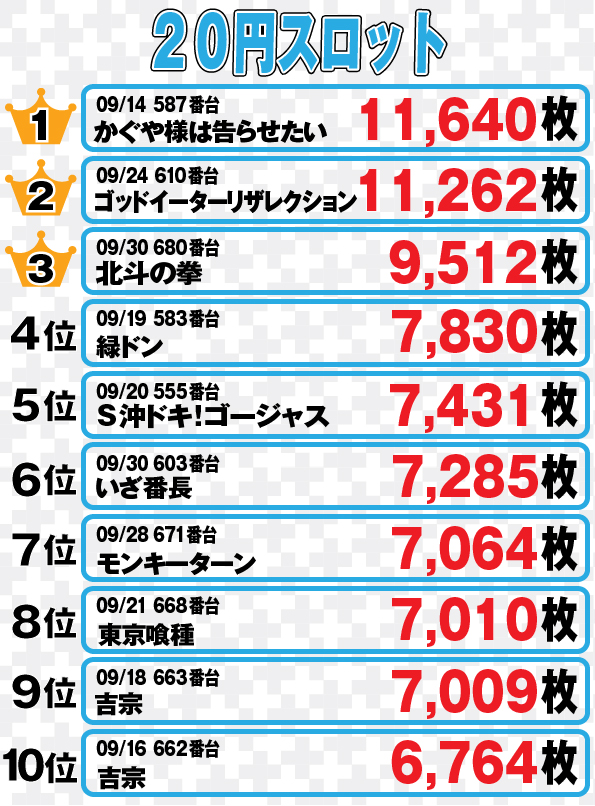 1位 10月7日(火) 2位 10月6日(月) 3位 10月8日(水)