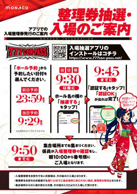 スマホアプリ 【777コンパス】で入場抽選を行います