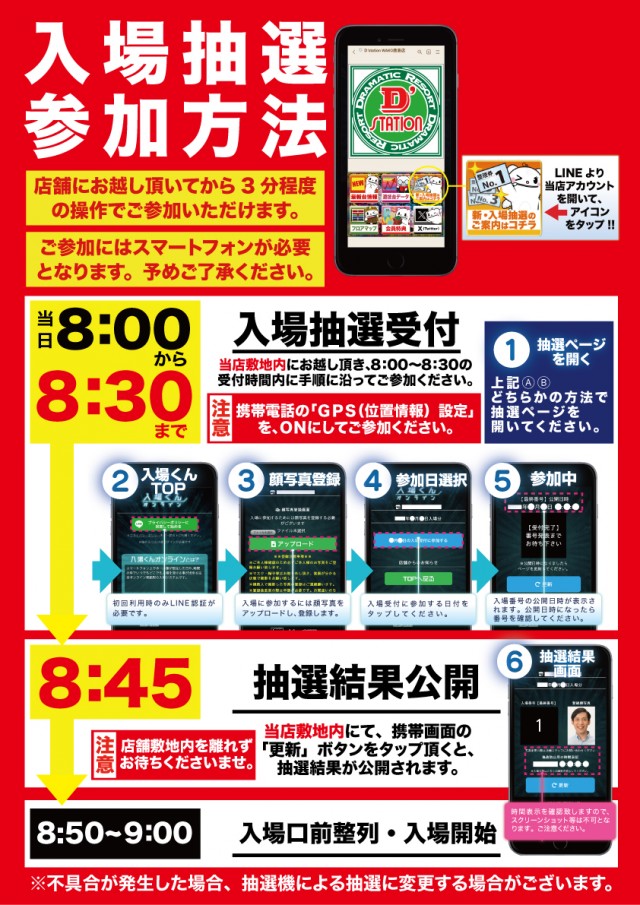 8:00~8:30の間に当店店舗駐車場にてオンライン抽選にご参加下さい。 |