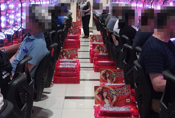開店時から人気のあった「CRスーパー海物語IN JAPAN」のにぎわいも大きく、笑顔をみせるプレイヤーは多い。