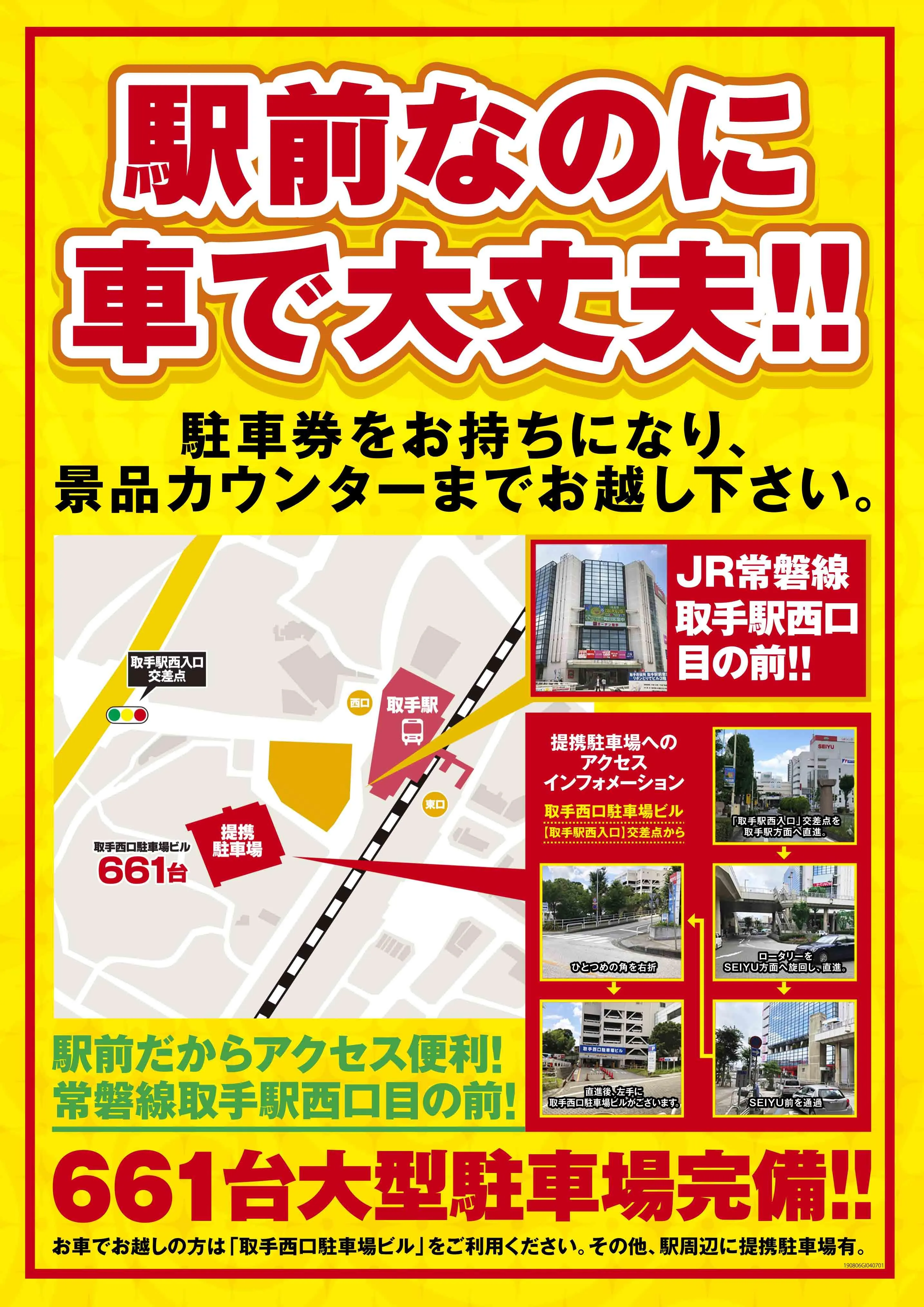 あり(661台) リボンとりで横の大型立体駐車場【取手西口駐車場ビル】へお車をお停め下さい。 |