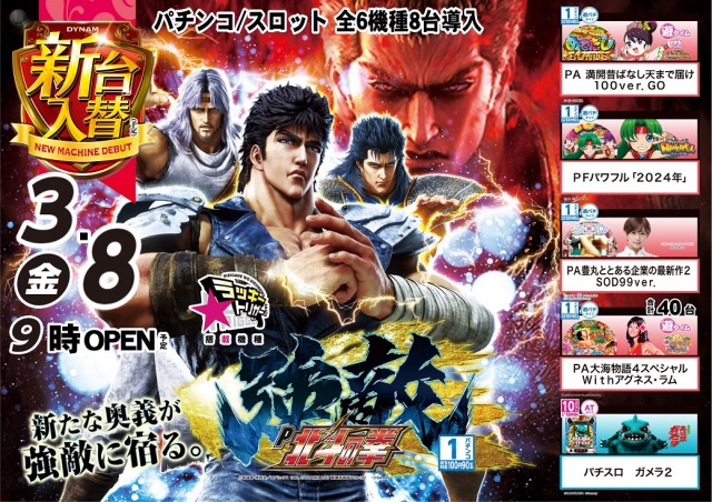 本日 3/8 新台入替 P北斗の拳 強敵含む、全6機種導入