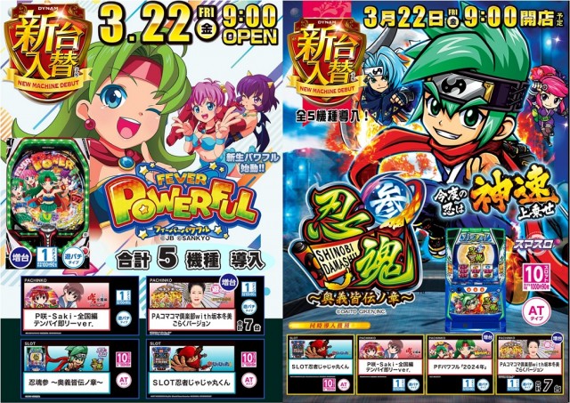 本日 3/22 新台入替 忍魂参含む、全5機種導入
