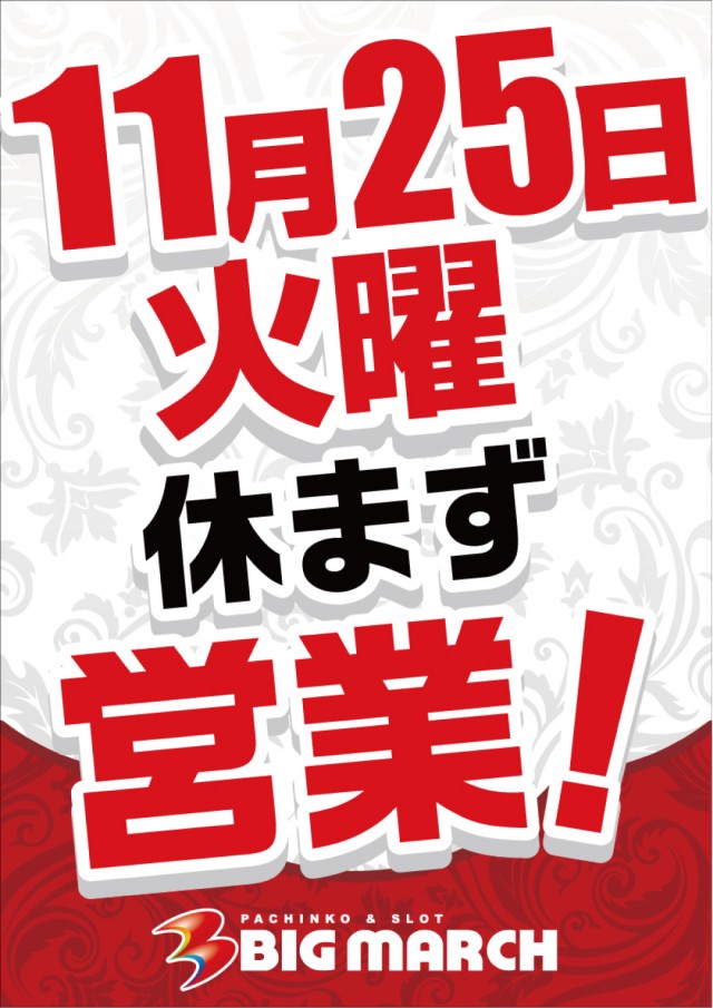 明日11月25日(火)は休まず営業9時オープン!!
