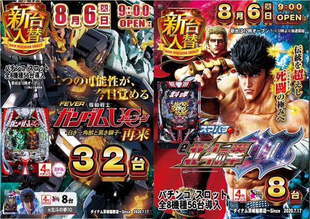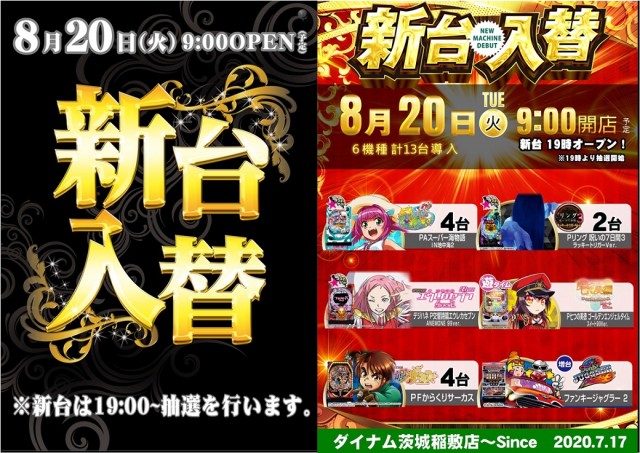 本日8/20新台入替(予定)!新台抽選は19:00実施!
