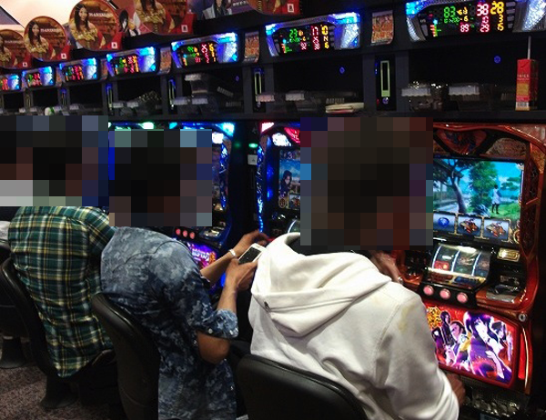 午後以降の様子をみてみると、20円パチスロでは「バジリスク〜甲賀忍法帖〜絆」、30パイコーナーの「沖ドキ!」やハナハナシリーズが大きな盛り上がりをみせていた。
