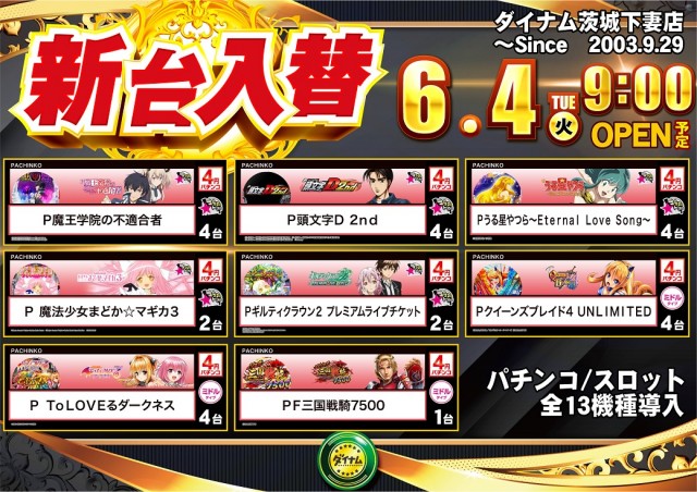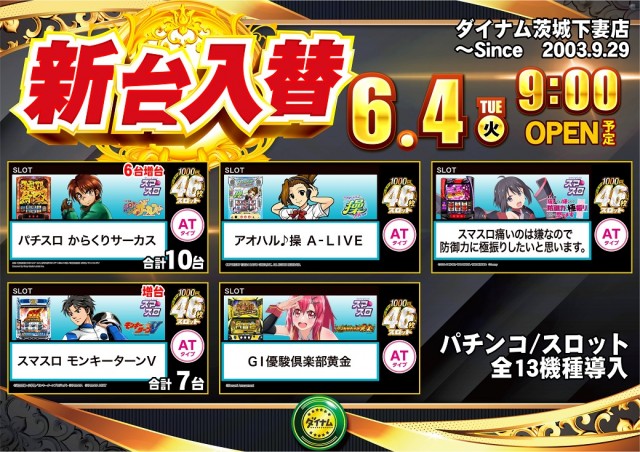 本日 6/4(火)新台入替!全13機種35台導入予定