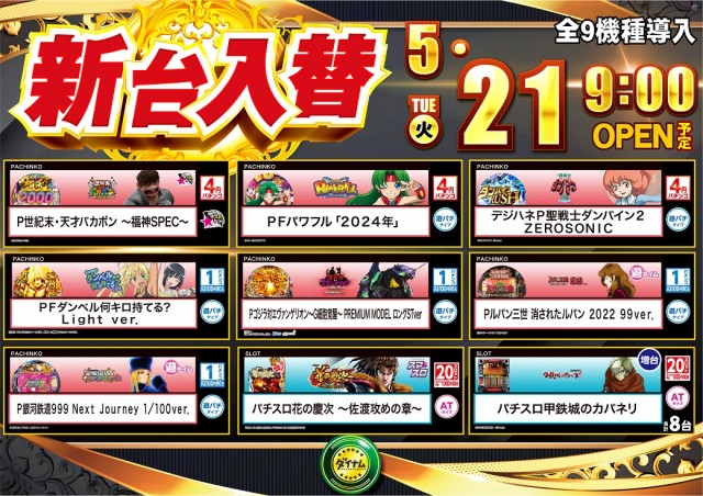 明日 5/21(火)新台入替!全9機種9台導入予定