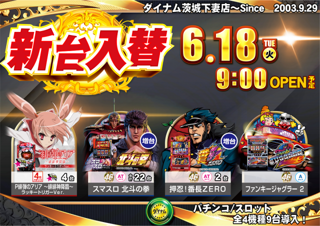 本日6/18(火)新台入替!LT緋弾のアリア含む全4機種導入