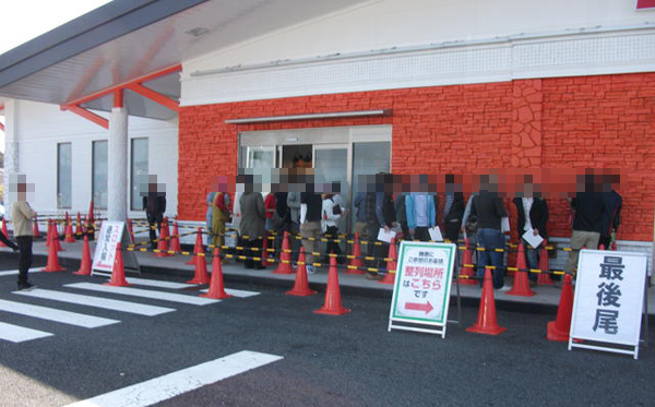 朝イチに集まったプレイヤーの人数は入場抽選と一般入場を合わせて60名ほど。パチンコとパチスロで入場する入口が異なり、パチスロに並ぶプレイヤーのほうが多かった。