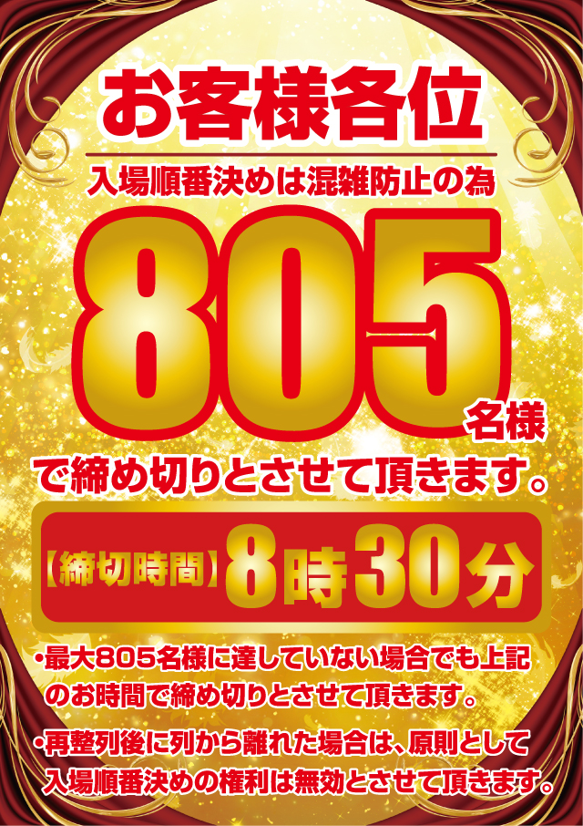 8:30までにお集まりのお客様を対象に抽選入場となります。 |