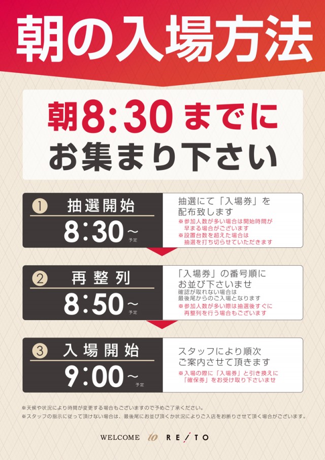 AM8:30迄にお並び頂いたお客様で店頭抽選にて入場順番を決める抽選を行います。 |