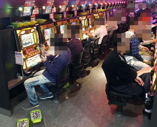 午後からのホール内の様子をみてみると、20円パチスロでもっとも目立っていた機種は「ミリオンゴッド-神々の凱旋-」や「アナザーゴッドハーデス」。