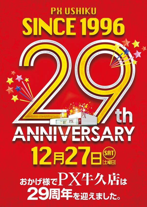 明日27日!!PX牛久店は29周年を迎えます!!朝9時開店!