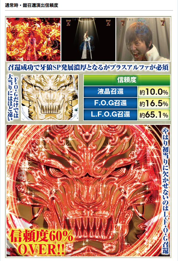 リーチ後に注目すべきポイントは鎧召還演出。赤いエフェクトのL.F.O.Gが発生した場合の信頼度は60%超と激アツだ。
