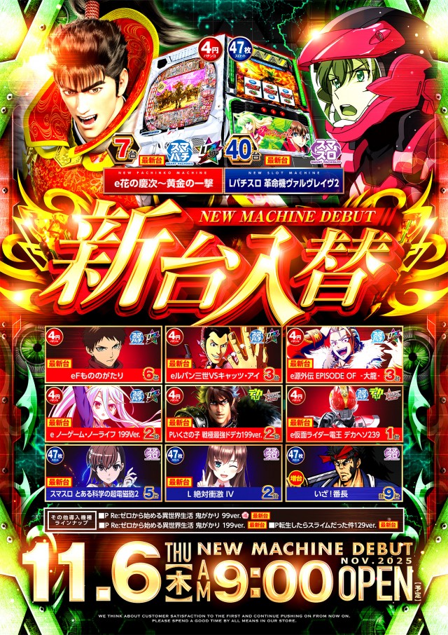 本日11月6日(木)新台入替! 8:30より入場抽選開始