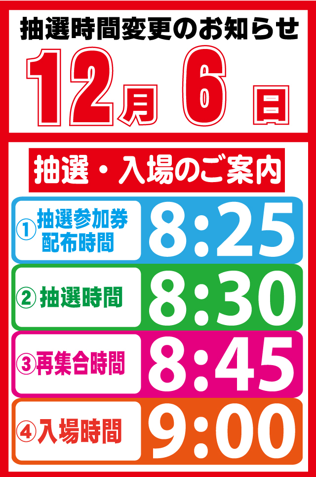 正面入口にて午前8時40分(混雑時は8時30分)に入場順番決めの抽選を行います。その後は並び順での入場となります。 |