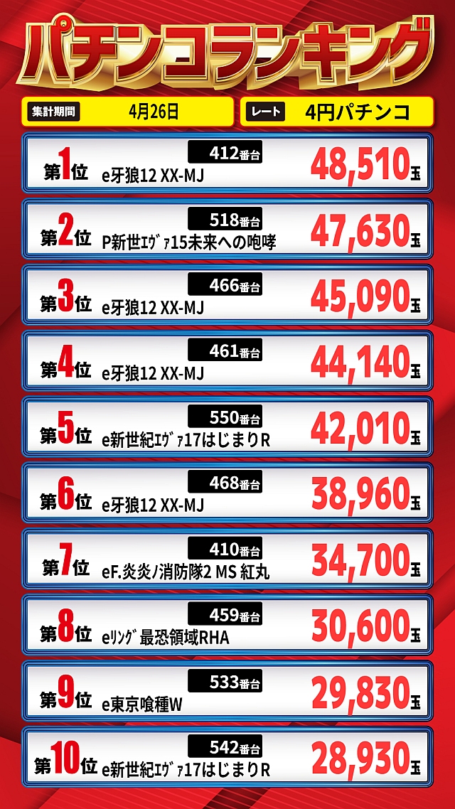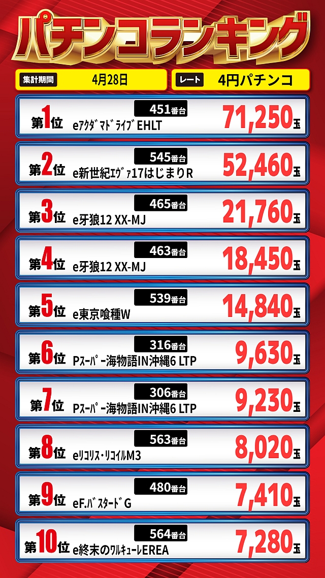 1位 4月6日(月) 2位 3月31日(火) 3位 4月26日(日)
