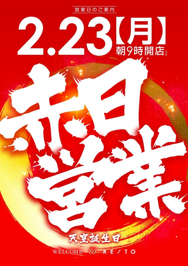 明日 2.23 (月・祝) 赤日営業!朝9時OPEN