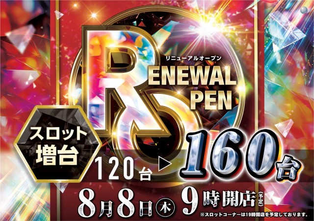 本日8/8(木)リニューアルオープン!スロット増台160台