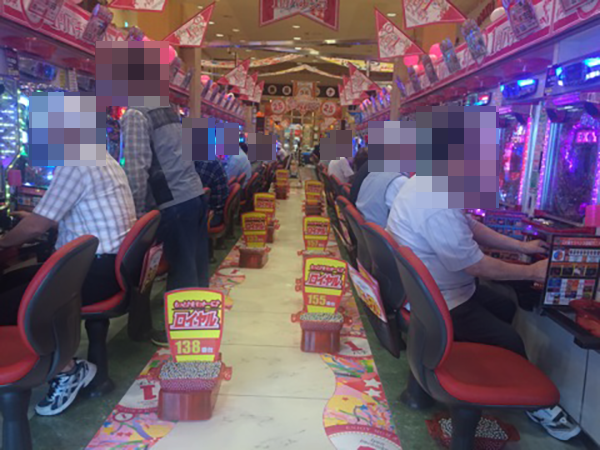 1円パチンコのコーナーでは多くのプレイヤーが遊技しており、楽しそうな表情のプレイヤーも多数。