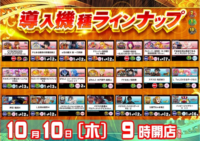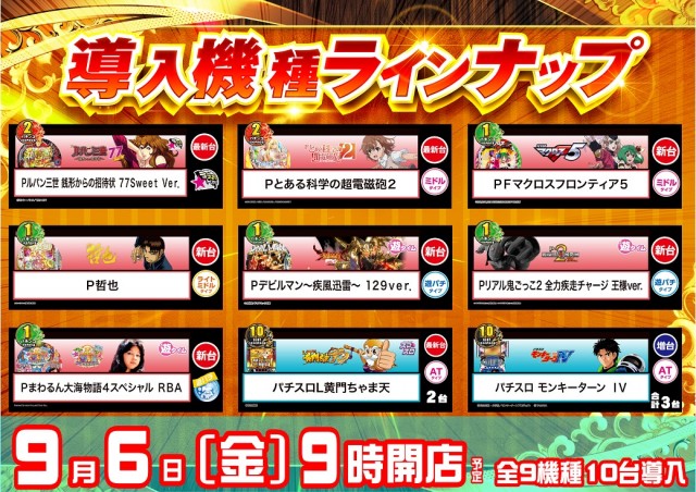 本日 新台入替開催!全9機種10台導入(予定)