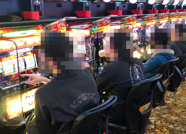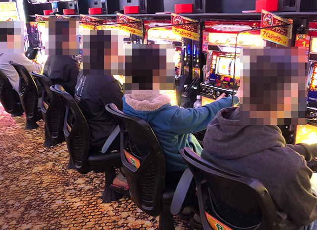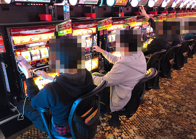 にぎわいに包まれたパチスロでは、「アイムジャグラーEX」がとくに盛況。パフォーマンスを披露しているプレイヤーが目立ち、鮮やかな光景が広がっていた。