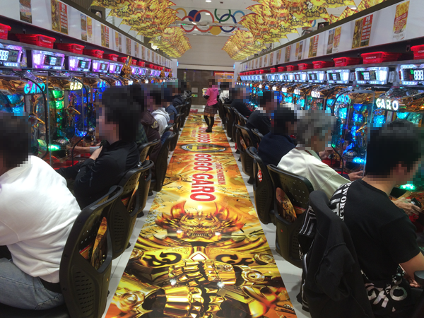 「CR牙狼 金色になれ」はシマの前に特設コーナーが設置されていた。50台と大量導入されている同機種だが多くのプレイヤーが集まり、活気にあふれていた。