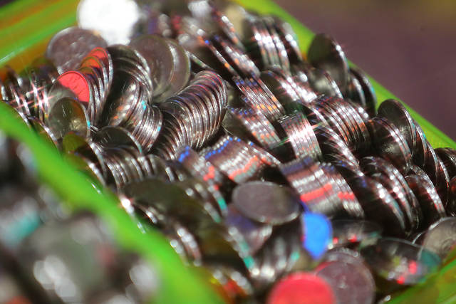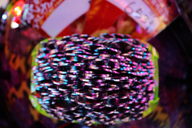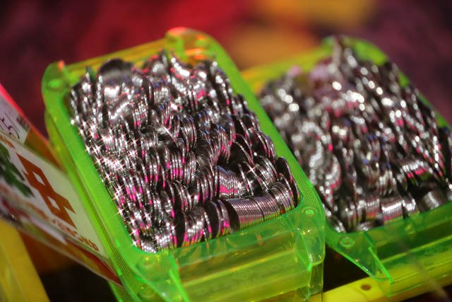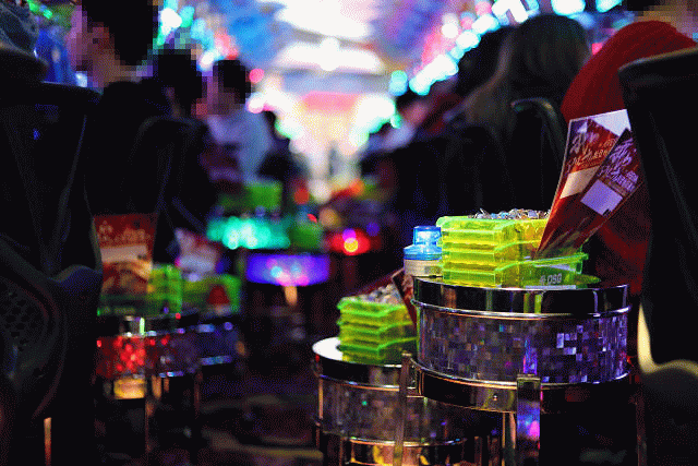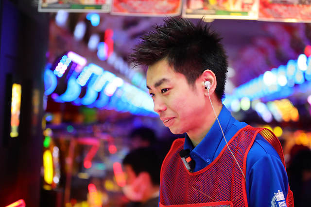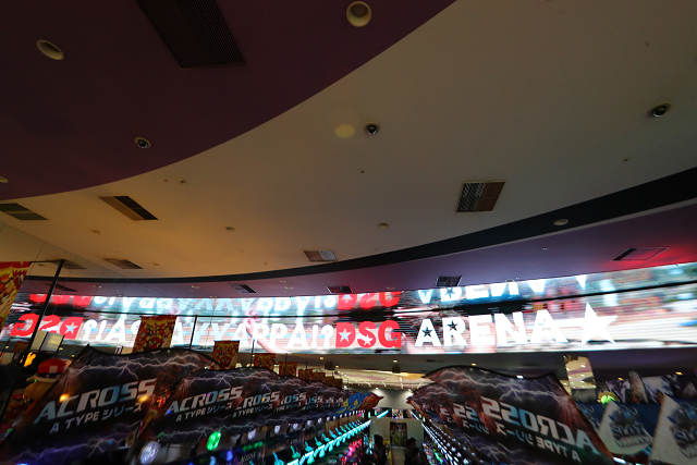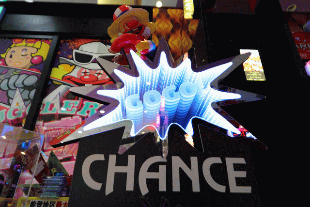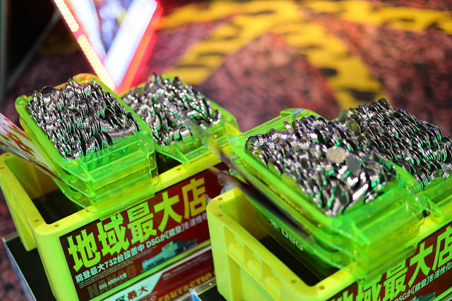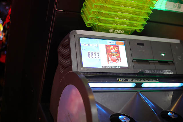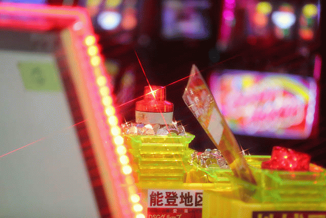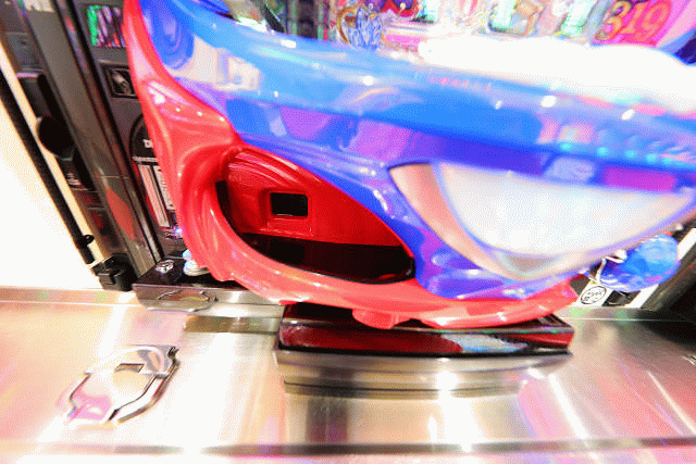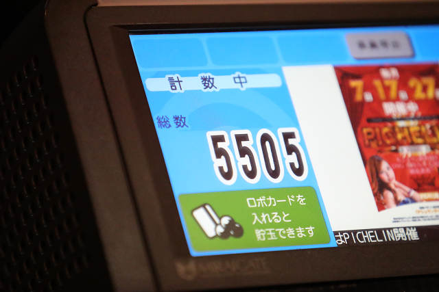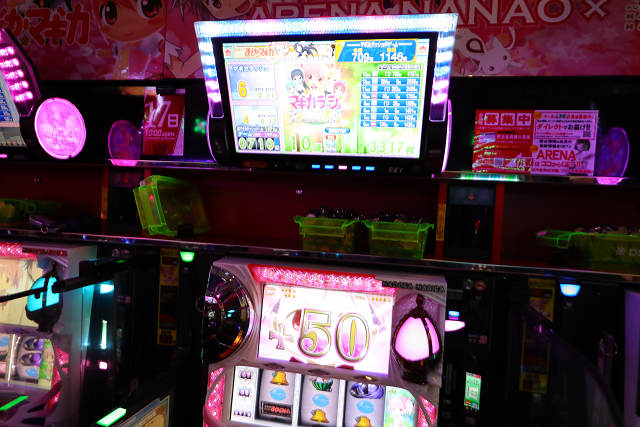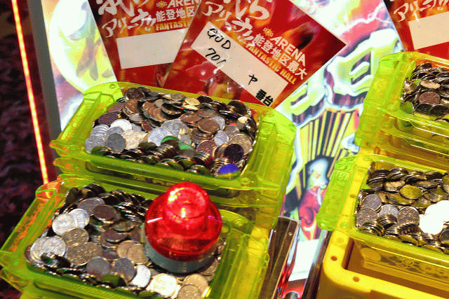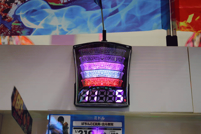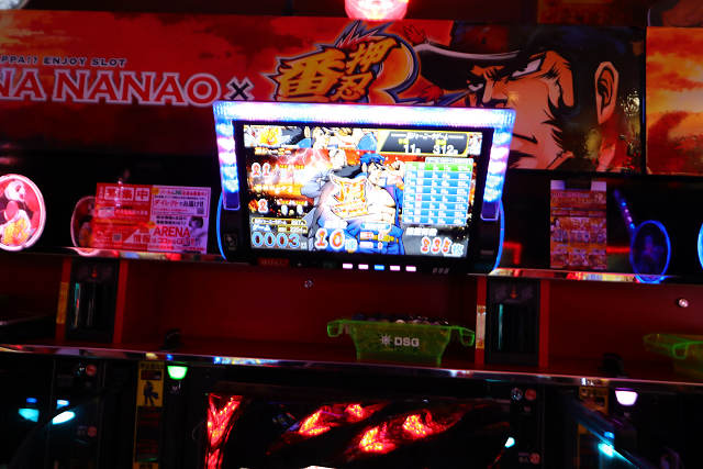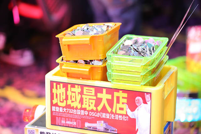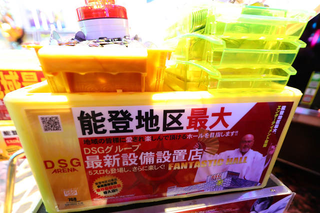 「DSGアリーナ七尾店」では、パチンコは各台計数機(パーソナルシステム)導入済みで、ファンの頭上、幕板には煌めくランプが設置されている。