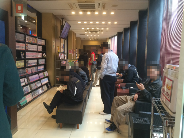 開店を待つ間は休憩スペースを利用することができるため、朝イチは多くの人がマンガを読んだりテレビを見たりとゆったりとした時間が流れていた。プレイヤーを見てみると、パチスロ専門店ということもあり多少若者の姿が多かったように思う。
