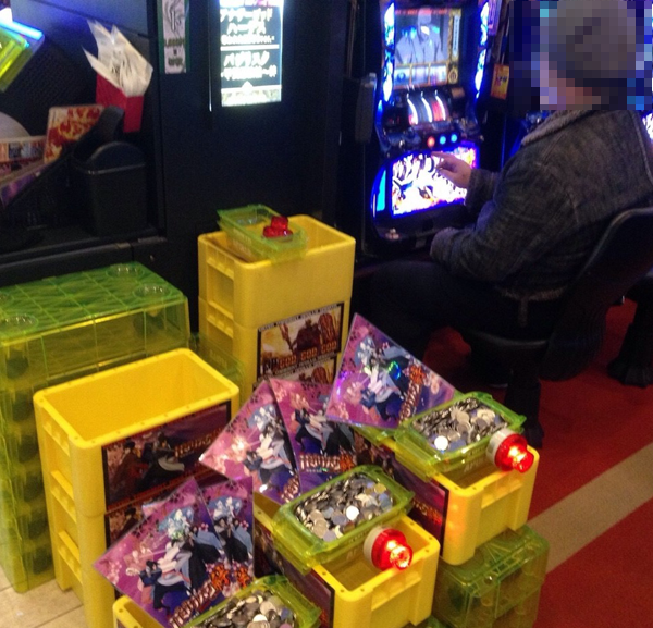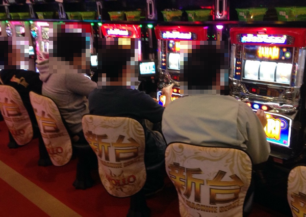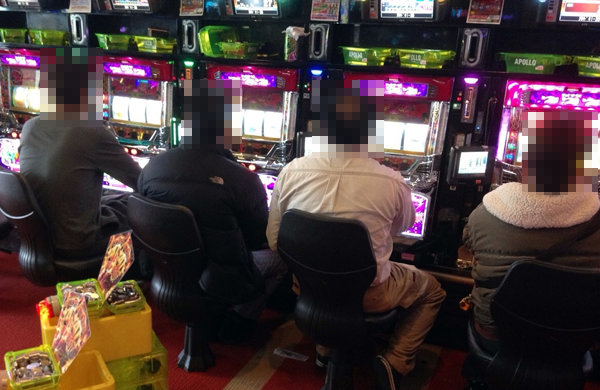 昼過ぎになると各台が徐々にその本領を発揮しはじめ、20スロの「バジリスク〜甲賀忍法帖〜絆」、「パチスロモンスターハンター月下雷鳴」、「ハナビ」、「パチスロ黄門ちゃま 喝」といった人気機種に目立った台が見られはじめる。