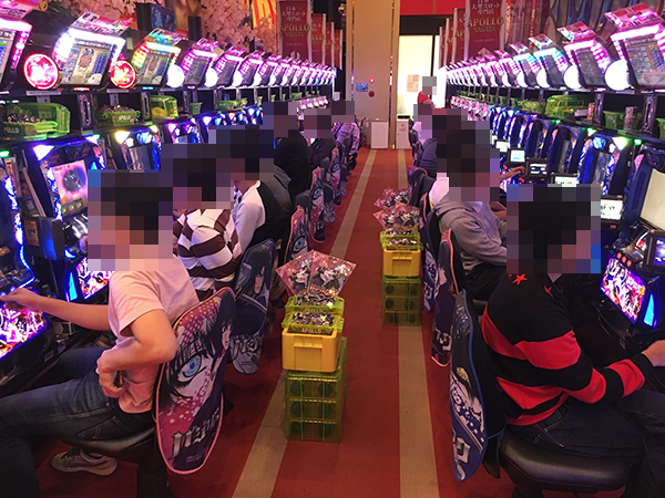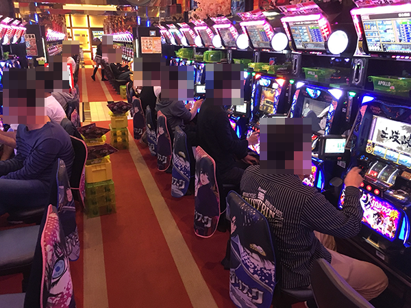 注目した機種を中心に、ホール全体が活気づいていた「APOLLO長田店」。