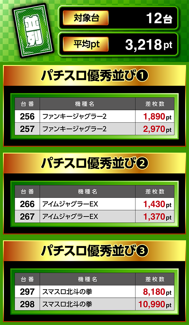297番台と298番台の「スマスロ北斗の拳」は並んで8,100pt超を超え、298番台は10,000pt上回った。
