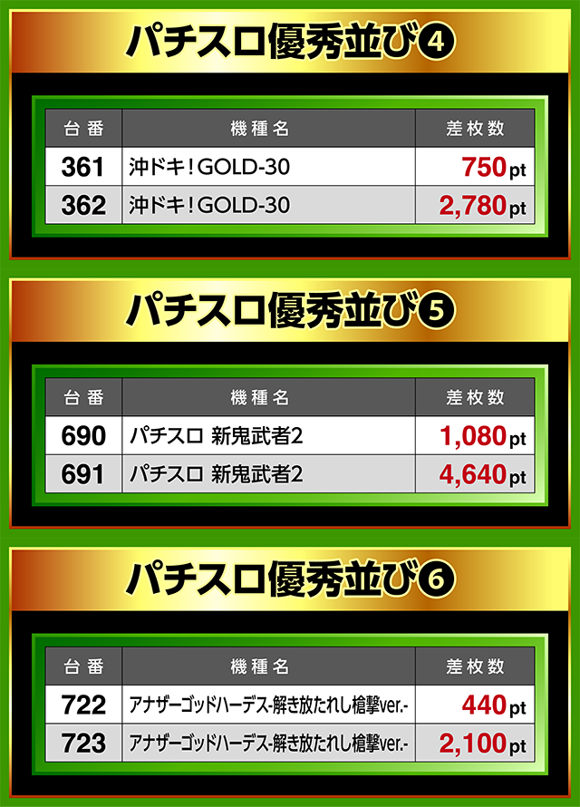362番台の「沖ドキ!GOLD-30」と723番台の「アナザーゴッドハーデス-解き放たれし槍撃ver.-」は、2,000pt以上となった。