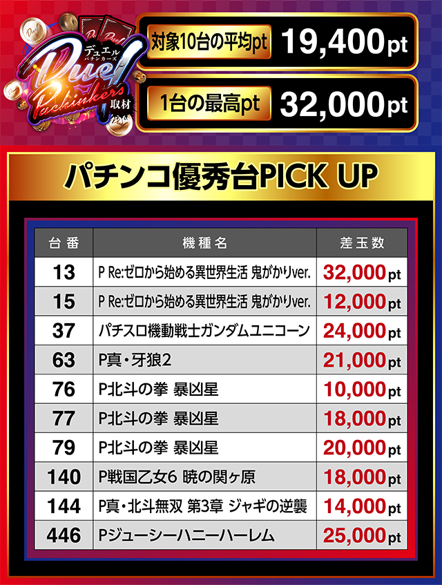 ほかにも、37番台の「パチスロ機動戦士ガンダムユニコーン」や446番台の「Pジューシーハニーハーレム」など、複数の台が20,000pt以上となった。