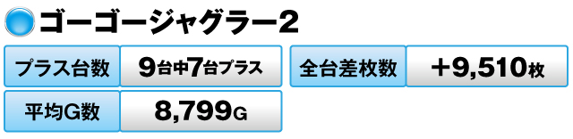 9台中7台がプラスで全台差枚数は+9,510枚、平均G数も8,799Gに達していた。