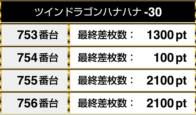 『ツインドラゴンハナハナ-30』の753番台から756番台までの4台が並んでプラスpt!