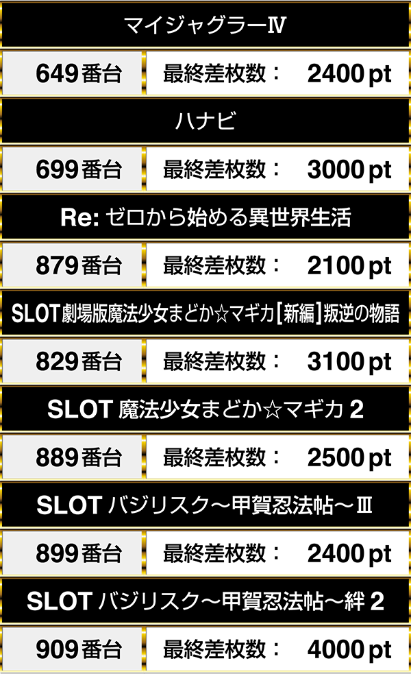 『ハナビ』の699番台と『SLOT劇場版魔法少女まどか☆マギカ[新編]叛逆の物語』の829番台は3000pt以上を記録!!