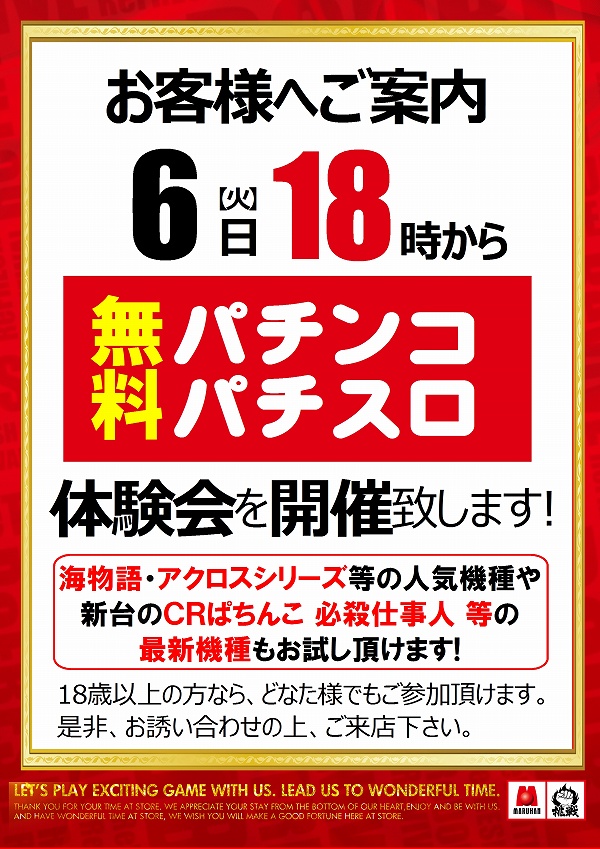 本日、店休日&18時から無料パチンコ体験会開催