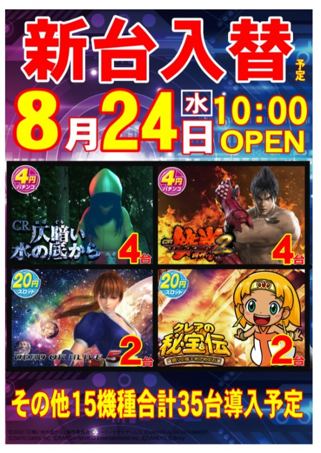明日 8月24日(水) 新台入替予定 朝10時開店