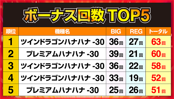 「プレミアムハナハナ‐30」も、50回以上のボーナスに当選した2台がTOP5入りを果たした。